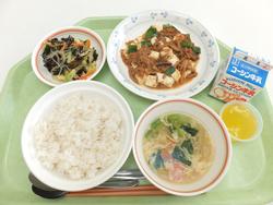 ごはん マーボー豆腐(大豆ミート) 春雨サラダ 小松菜と鶏肉のスープ オレンジ&ピーチゼリー 牛乳 |