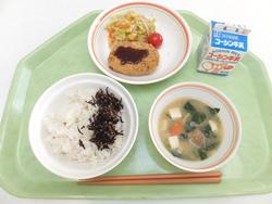 ゆかりごはん かぼちゃコロッケ プチトマト ブロッコリーとキャベツのごま和え たら汁 牛乳 |