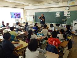 英語ルームでは、専科の先生が5年生と授業中です。タブレットも活用しています。