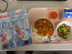 今日のお話は、「給食室のいちにち」という絵本からのメニューです。絵本の仲間では紹介できないですが、ほとんど絵本の絵と同じような献立でした。