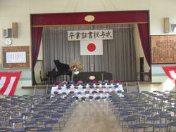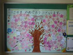 ステージ周辺は、演台・ひな壇・看板・国旗… 結構大変です。5年生掲示板には、6年生へのメッセージが飾られていました。