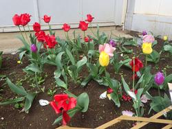 ●写真1枚目…新年度のスタートの朝を迎えました。●写真2枚目…校庭の桜もまだまだきれいに咲いています。●写真3枚目…昇降口前のチューリップも子どもたちの進級を祝うようにきれいに花開きました。