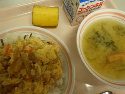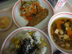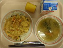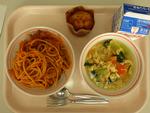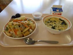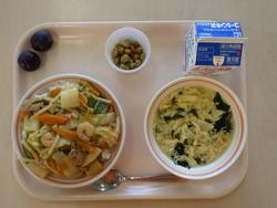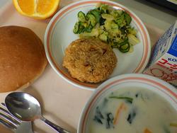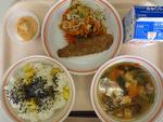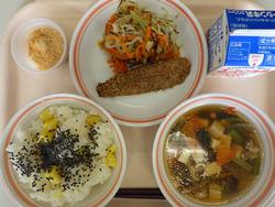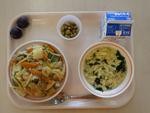ごはん たかなふりかけ にくどうふ もやしとコーンのごまあえ みかん 牛乳 | カレーうどん わかさぎの唐揚げわかめと大根のサラダ 甘納豆むしぱん 牛乳 | ホットバーガー ツナポテト アルファベットスープ オレンジ牛乳 | ごはん タラのチリソース バンサンスー はくさいととうふのスープ りんご 牛乳 | おやこどん えのきとだいこんのみそしる バナナ 牛乳 |