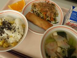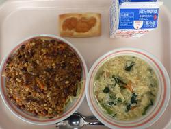 ビーンズカレーパスタ ポテたまスープ アップルデニッシュ 牛乳 | さつまいもおこわ いわしのねぎみそまき やさいのこんぶあえ すまし汁 オレンジ 牛乳 | すきやきどん だいこんとわかめのみそ汁 ごまだれだんご 牛乳 | ||