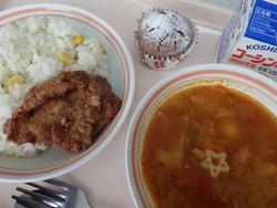 ゆかりごはん さわらの幽庵焼きあおなともやしのごまあえ 根菜のみそしる みかん 牛乳 | ごはん とうふのチリソース わかめとたまごのスープ オレンジ 牛乳 | キャロットパン シェパーズパイホグワーツのかぼちゃのスープ ひゃくみゼリー 牛乳 | ごはん さけのチャンチャン焼きせんべいじる りんご 牛乳 | コーンライス フライドチキン ミネストローネスープ クリスマスチョコマフィン 牛乳 |