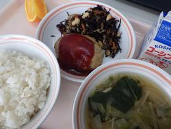 新年最初の給食にふさわしい華やかな献立でした。紅白の「白玉」や祝いの「なると」には感激しました。とてもおいしかったです。 | 新年恒例のおみくじハンバーグです。なかに、人参、パプリカ、インゲン、さつまいものどれかが入っています。ワクワクしながら… | |||