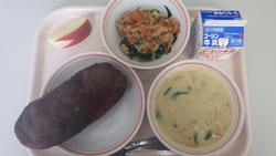 ごはん 生揚と豚肉のみそ炒め きのことたまごの中華スープ あまなつ 牛乳 | 洋風ちらし いなだの西京焼き すましじる さつまいもチップス牛乳 | 黒糖パン ミートポテトグラタンアルファベットスープ しらぬいセレクトミルメーク 牛乳 | ごはん ししゃものパリパリあげごもくまめ はくさいとわかめのみそしる いちご 牛乳 | チキンライス シチューパイ かいそうサラダ はるか 牛乳 |