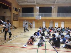子供たちの前で「野猿道中」という足を振り上げながら前に進むという演目を太鼓付きで実演していただきました。体育館に太鼓の音が響き渡っていました。