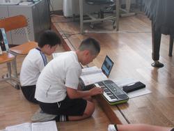 リコーダーやミニキーボードを演奏していました。音を出すことも表現のひとつです。よく聴いていると、同じ譜面ですが、表現している子供によって、多少の違いが感じられます。音楽の授業としては正解があるかと思いますが、いろいろな表現があって、私は面白いと感じました。