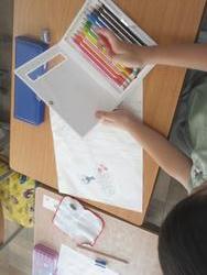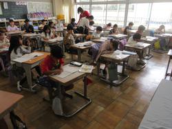 先生の前に長蛇の列ができあがっていました。昨日の校外学習の様子を作文にする授業です。楽しい思い出を文と絵で楽しそうに表現する1年生でした。