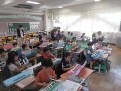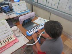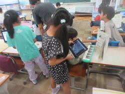 鍵盤ハーモニカの練習をしていました。そして、自分ができたところはタブレットを用いて動画で撮影します。友だちに撮影してもらう子がほとんどでしたが、中には自撮りしている子もいます。音楽においても、タブレットを活用していろいろなことにチャレンジしています。