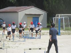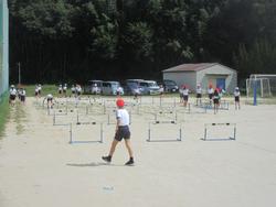 ハードル走の授業です。ハードル間をリズム良く飛び越すことができるかが、ポイントです。振り上げ足や抜き足など、難しい技術が必要になってきますが、自分の課題に向き合って練習していました。