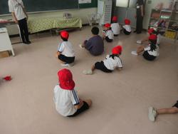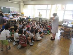 打楽器を7種類用意して、歌と楽器をクラスみんなであわせていました。控えめに音を出す子、自信満々に大きな音を出す子、何となく性格を感じることができました。みんなの前に出るだけでもドキドキなのに、笑顔で演奏することができました。
