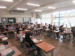 千葉県西部防災センターの方が来校して、防災についての授業が行われました。2択クイズなどもあり、防災について楽しみながら学ぶことができました。