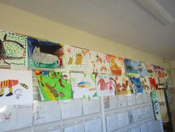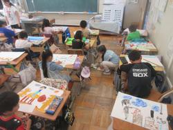 2年生が大きな紙に絵を描きました。1組は作品カード作り、2組はすでに掲示してあります。ぜひ見に来てください。