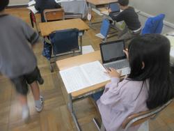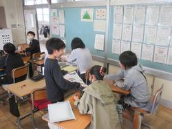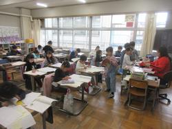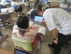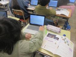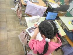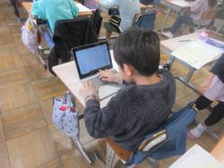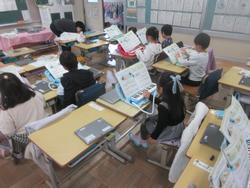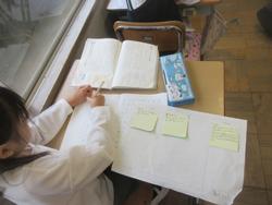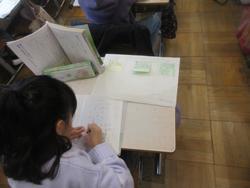 まちの「すてき」を紹介する学習です。町探検で伺った地域のお店や施設について、付箋を用いてメモを取り、ノートやプリントに文章でまとめていました。途中で先生のチェックも入ります。中にはタブレットで文章作成している子もいました。どんな「すてき」を紹介してくれるのか、楽しみです。