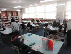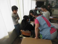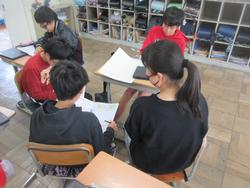 話し合いの仕方自体を学ぶ時間で、3,4人のグループごとに話し合っています。話し合いをどうするかについての話し合いと言うことですね・・。司会や発言者、記録等、役割があることを確認していました。