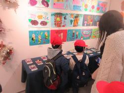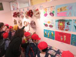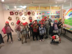 まずは上二小の作品が展示しているところで集合写真を撮りました。その後、展示されている自分の作品を見て、とても嬉しそうな表情をしていました。