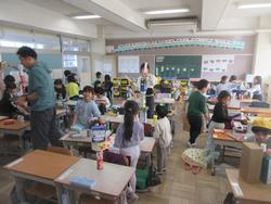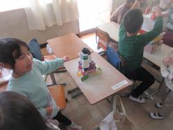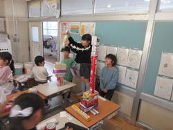 図工? 生活科? と思って入ったら、算数の「かたちあそび」をしていました。持ってきたいろいろな形(お菓子の箱など)を使ってタワーを作っていました。やはりどれだけ高く積み上げることができるかということを頑張っていた子が多かったです。