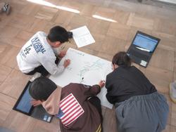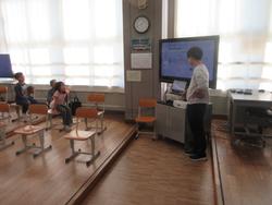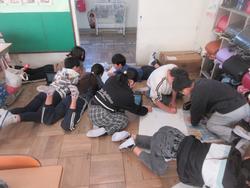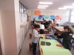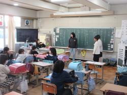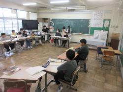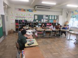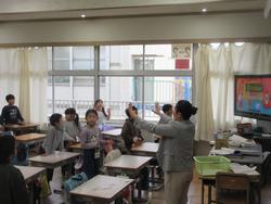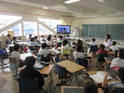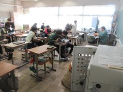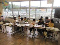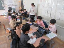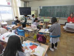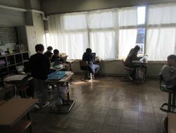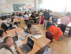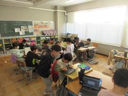 もう一つの4年生のクラスでは、社会で坂川について学習しています。グループごとに模造紙に学習してきたことや自分の考えをまとめていました。リラックスした感じで学習していますが、頭の中はフル回転です。理科でも社会でも、友だち同士で頭をつき合わせて学ぶことができるのも、学校の良さだと思います。