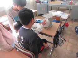 はかりを使って、重さをはかる授業をしていました。ほとんどの子にとって、おそらく経験がないことだと思います。針や単位など、はかりをじっくり見ながら学習を進めていました。タブレットではない、実際の経験を積むということも大事にしていきます。