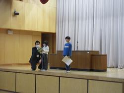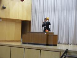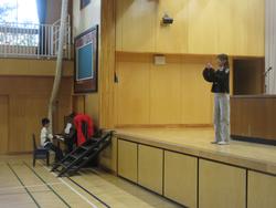 4年生ふたりから、2学期にがんばったことの発表がありました。ランランタイムやブラスバンド部、クラブ活動など、頑張った思い出を堂々と話すことができました。生徒指導関係でもふたりの先生に登壇してもらい、冬休みの生活について、そして体育用具などのものの使い方などについて、お話がありました。