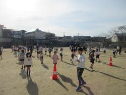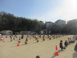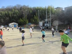 なわとびの二重跳びに挑戦していました。いきなり縄を持ってチャレンジするのではなく、まずはジャンプをしながら体の前で2回拍手ができるか、二重跳びに繋がる動き作りをしていました。空中にとんでいるタイミングで拍手をするので、意外と難しいです。寒い冬、なわとびはすぐに体が温まる運動なので、おすすめします。