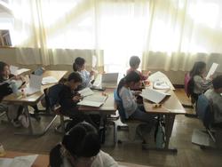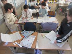 飲食店でのやりとりを想定して、子供たちが学習を進めています。注文のしかた、また店員の立場で注文の受け取り方、メニュー自体を考えているグループなど、様々な学習が行われていました。一人一人が友だちと協力しながら、しかも楽しそうな雰囲気で授業が展開されています。