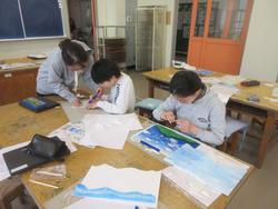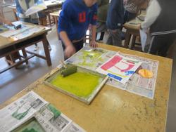 スチレンボードを活用した版画に取り組んでいます。たしか、昨日から取り組み始めていたことはわかっていましたが、今日にはほぼ作品になっている子が多く、びっくりしました。版画はイメージ通りにできる部分と、偶然にできる部分があり、そこが面白いところです。みんな楽しそうです。