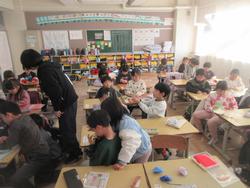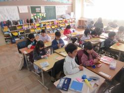 業間休みの後、1年生の教室ではなわとりカード作りが行われていました。プリントの外枠を切るためにハサミを使ったり、カードにのりで貼り付けたり、いろいろな手作業があります。カード作り自体が学習です。手先をしっかり動かすことも低学年は大切なことです。失敗しても構わないので、自分でやってみると言うことを大事にしてほしいと思います。