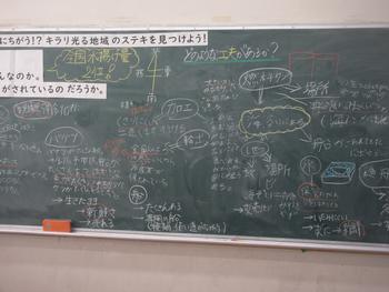 子供たちによって集められた情報が、黒板いっぱいに書かれてあります。千葉県の銚子市について学習していました。様々な情報が書かれてありましたが、友だちが調べた情報はタブレット上で見ることができるので、その以外の情報を調べようと言うことになります。その結果、クラス全体としてたくさんの、またいろいろな情報を集めることができました。