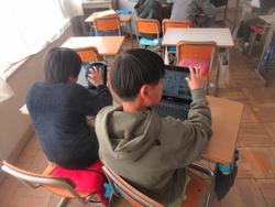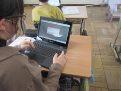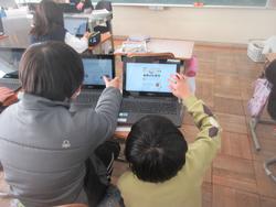 「みぶりでつたえる」という学習をしています。身振りの動作を録画して、その身振りの意味を入力します。最後は友だちの身振りを見て、その身振りの意味が伝わったかどうかの確認をしました。友だちやクラスのみんなに撮った動画を見られるのは恥ずかしそうでしたが、とても楽しい雰囲気で授業を行われていました。