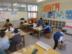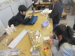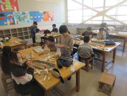 のこぎりを使った制作活動が続いています。木工用の接着剤を使って、細かい部品を丁寧にくっつけながら、作品作りを楽しんでいました。最初に思い描いた通りにいかないことの方が多い作品づくり。だからこそ、その場の思いつきや軌道修正により、自分でも思ってもみなかった素敵な作品ができあがることもあります。その偶然性もぜひ楽しんでください。