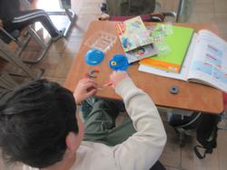 上がっているのは気分だけではなく、水温もです。水がどのように温まるのかを実験していました。青色の液体を使っています。この特別な液体は温度が上がるとピンクに変わります。色が変わって行く様子に驚きの声を上げていました。どこから温まっていくのか、見えたかな。