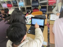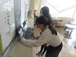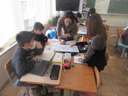 帯グラフ・円グラフの発展で、身近な問題についてグラフにまとめて整理分析していくという授業です。グラフにするにはデータが必要です。フォームスのアンケートを作成したり、紙のアンケートを作成したり、グループごとでどうまとめていくのかを話し合っていました。グラフを作ることが目的ではなく、そこから何を考え、生活にどう生かしていくのか、実生活に関することなので大人になったときにも使える力ですね。