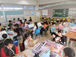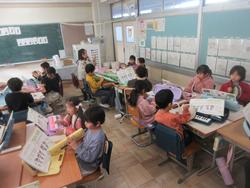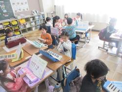 鍵盤ハーモニカ、タンブリン、トライアングルの3つの楽器を使って、合奏をしていました。グループごとに楽器を交換しながら、楽しく演奏しています。みんなで音をあわせること、違う音を同じリズムであわせることがとても楽しいと感じる時間です。これからも音を楽しんでください。