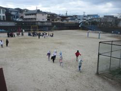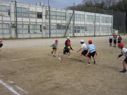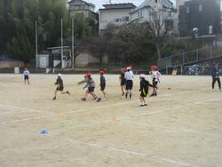 タグラグビーの授業をしていました。相手陣地奥までボールを運び、トライを狙います。前に行きたいのにボールを前に投げられないルールがあるので、子供たちは頭をいっぱい使っています。チームのみんなでボールを運ぶにはどうしたらいいか? いっぱい考えて欲しいと思います。