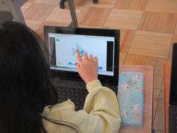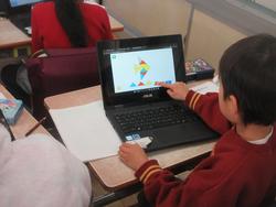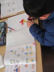 「かたちづくり」の学習です。三角形の色板を動かして形を作っていきます。今日はタブレット上で操作をしていました。本物の色板を動かしながら思考することも大切ですが、タブレット上でも考えられるようにすることも必要だと考えています。いろいろな学び方を試しながら、自分にあった学び方を見つけて欲しいと思います。