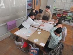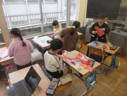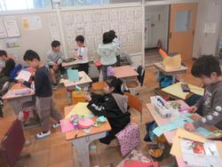 何種類かの色画用紙を使って、自由に作品をつくっていました。紙を丸くしてジェットコースターのようなものを作ったり、花びら1枚1枚の色を変えた花を作ったり、思い思いに活動を楽しんでいました。「もう1時間、図工がしたい。」という声が出るほど、夢中になっている子供たちでした。