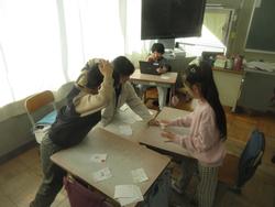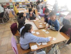 カルタで楽しんでいます。絵札は手書きで作成し、読み札はタブレットで作成したようです。そのため、グループ一人はタブレット上の読み札を呼んでいます。楽しみながら言葉を増やしたり、理解を深めたりしてほしいと思います。