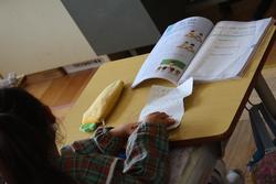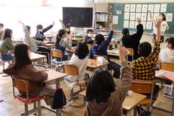 1年生道徳 クラスのよいところを考えてワークシートに書いています。