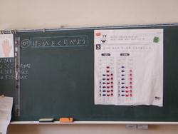 1年1組算数「わかりやすくせいりしよう」の学習です。どちらがどれだけ多いかを調べるには、グラフに表すとよいですね。グラフから引き算の式を組み立てることもできますね。