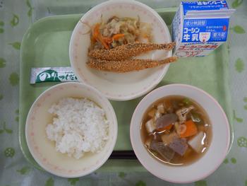 献立名:ご飯 鰯の竜田揚げ 豚汁 おひたし レモンソーダゼリー 牛乳