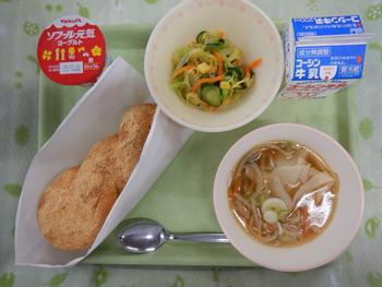 サラダは「カリカリサラダ」です。もやし・人参・キャベツ・枝豆・コーンを茹でて冷まし、ドレッシングで和えました。食べるときに、別配のポテトチップスを混ぜて食べましょう。 今日のスープに入っているマカロニは、米粉で作られたものです。もちもちした食感を楽しんでください。