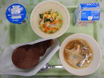 献立名:ココア揚 げパン ワンタンスープ レモンソースサラダ 牛乳