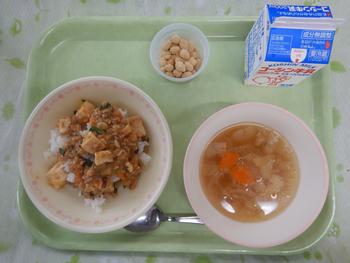 献立名:麻婆豆腐丼 白菜 と卵 のスープ きなこ豆 牛乳