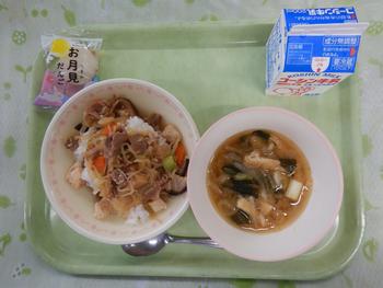献立名: 豚肉のすきやき丼 みそ汁 お月見団子 牛乳