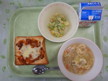 献立名: ピザトースト じゃがバタソテー キャベツのスープ 牛乳