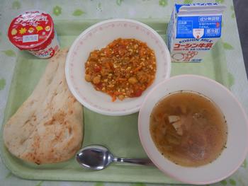 献立名: ナン ドライカレー コンソメスープ ヨーグルト 牛乳