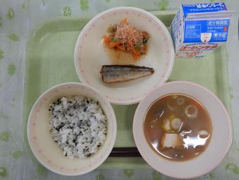 献立名: 若芽ご飯 秋刀魚の塩焼 おろしあえ さつま汁 牛乳